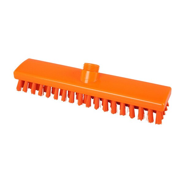 This FDA approved 12" Deck Scrub is equipped with ultra-stiff bristles that are most effective for scrubbing surfaces with stubborn messes and ideal for use in heavily soiled areas. Strong, secure anchorage for all bristles, reduces the risk of foreign particle contamination. Our wide color range ensures the support of your HACCP Plan and Color Code. The extra stiffness of these bristles is also ideal for maximum cleanliness to assure the best sanitation practices in your facility. Compatible with any Amerisan outside threaded hexagonal handle. This brush is often referred to as a "broom," "floor scrub," or "deck scrub". 12" x 2.5" (300 x 60 mm) Polyester PBT 0.50 25 mm Stiff - Orange