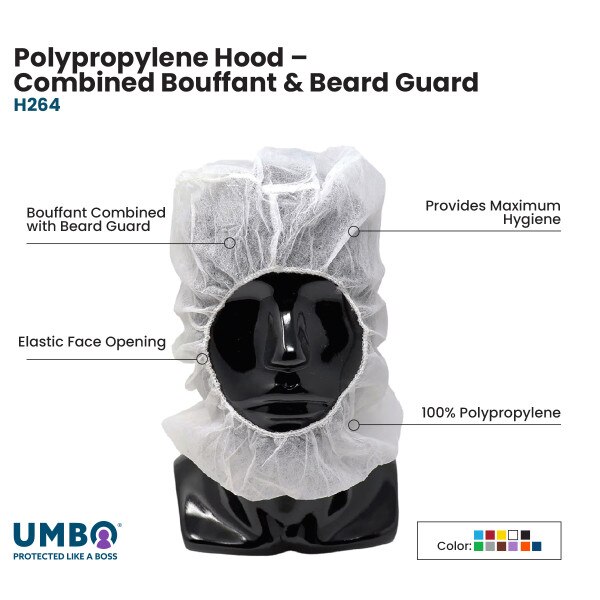 Large Polypropylene Hood, Combined Bouffant & Beard Guard. Stay safe and hygienic with our all-in-one head and facial protection. Our polypropylene hood offers complete coverage, preventing hair and beard particles from contaminating work areas. Ideal for industries requiring strict cleanliness standards, such as food processing, healthcare, and manufacturing. The balaclava-style hood can also be used in laboratories or for protection when carrying out maintenance and other manual work. Latex Free. Elastic band that ensures a comfortable fit. Meets FDA food handling standards. Disposable.